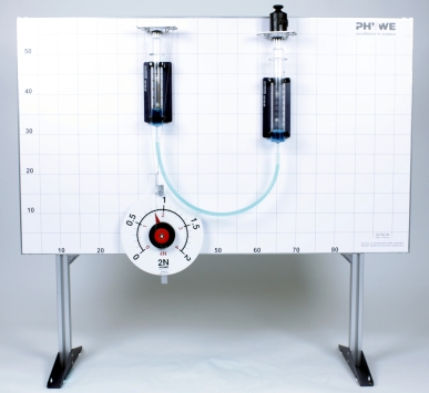 - Demonstrative measurement of forces with large circular dynamometers with a fixing magnet and ball-bearing pulley with two cord grooves for two measuring ranges