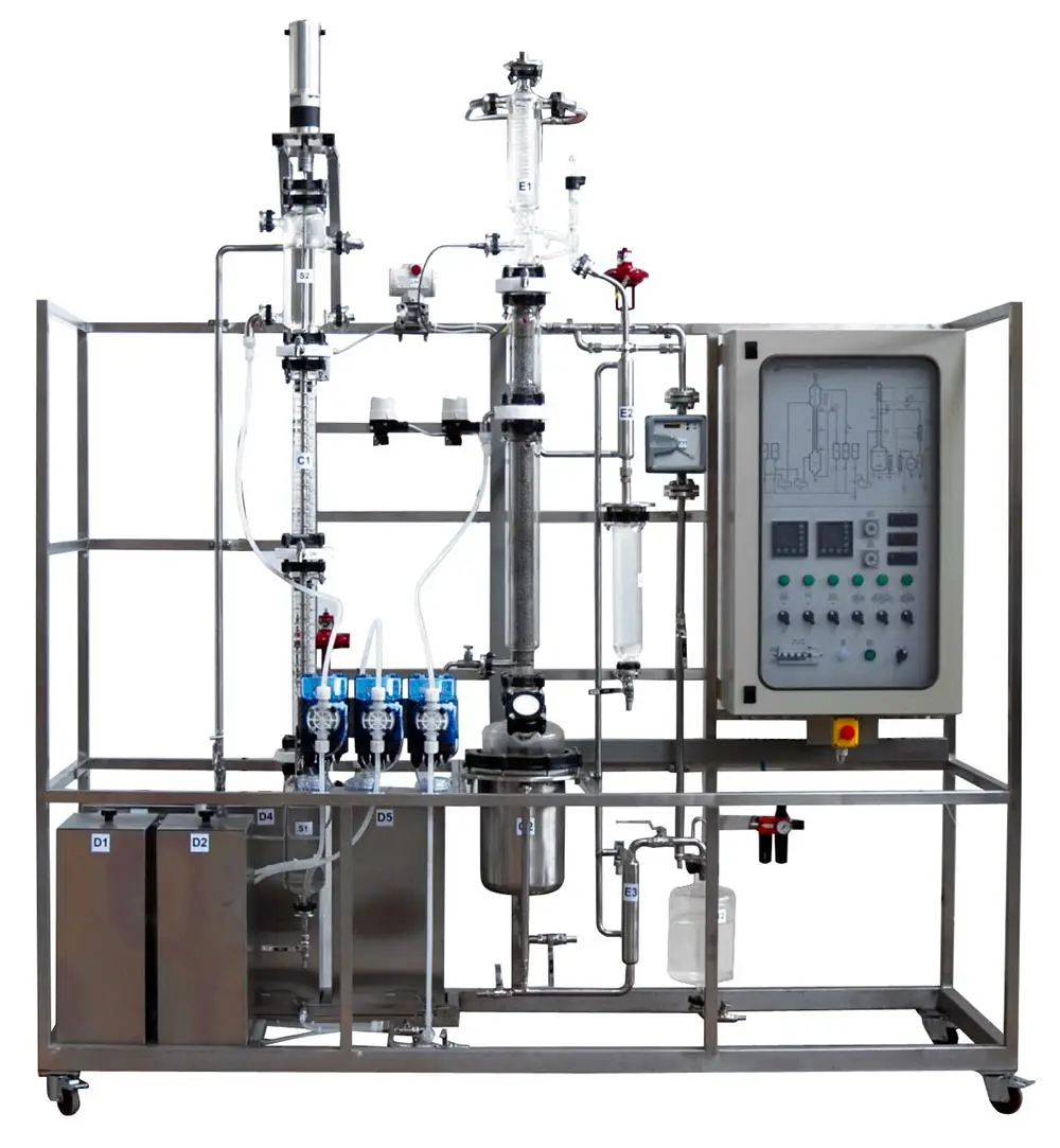 Multifunctional extraction and distillation pilot plant This plant consists of a liquid-liquid extraction column of glass with rotating discs installed aside a distillation column. This last column can be used to recover the solvent used for the extraction, or separately for the study of distillation process.
