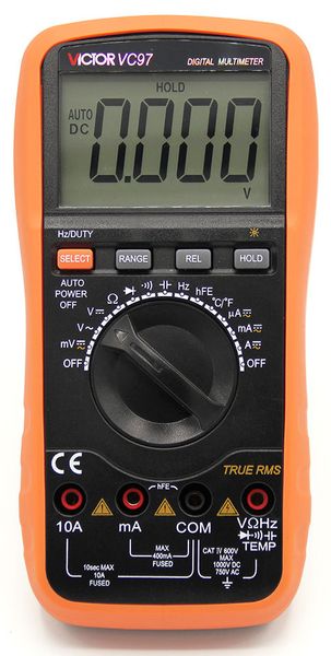 Digital multimeter with auto-range function for the measurement of direct and alternate voltage, direct and alternate current, resistance, capacitance, frequency  and temperature.